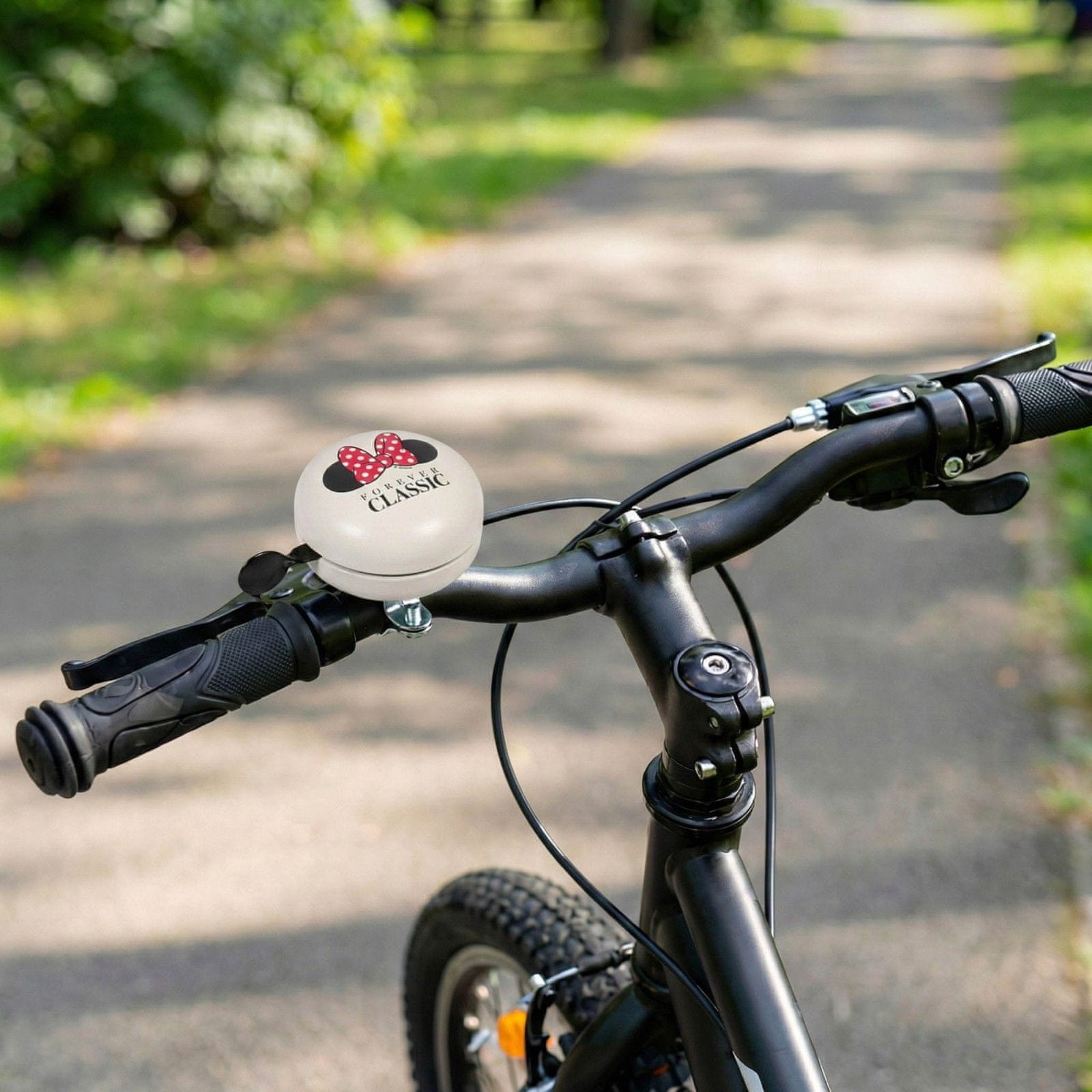 Kovinski zvonec za kolo v retro slogu navdušuje z elegantno, minimalistično grafiko, ki jo je navdihnil lik Minnie Mouse (Mini Miška), ki že leta ostaja ikona razreda in šarma.