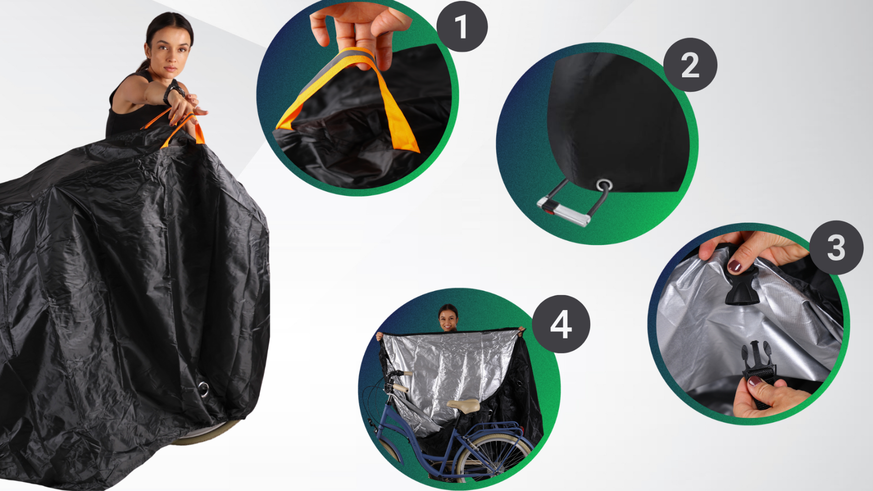 • Visokokakovosten poliester 210D s PU poliuretanskim premazom – učinkovito ščiti vaše kolo pred dežjem, prahom, zmrzaljo in UV-sevanjem, ki je škodljivo za lak in gumijaste elemente