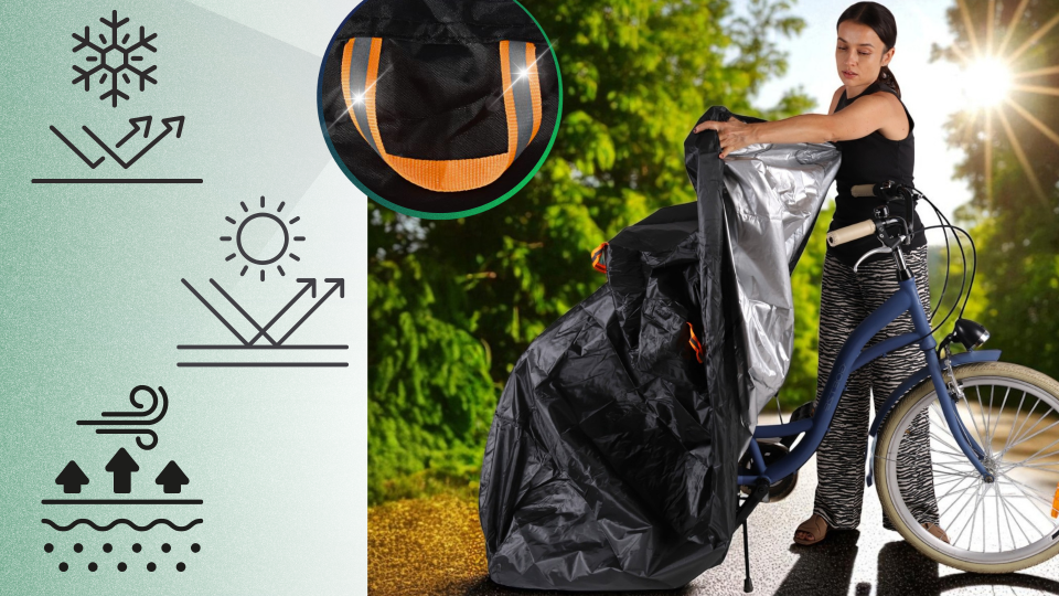 • Visokokakovosten poliester 210D s PU poliuretanskim premazom – učinkovito ščiti vaše kolo pred dežjem, prahom, zmrzaljo in UV-sevanjem, ki škoduje laku in gumijastim elementom