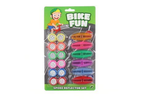 Set barvnih plastičnih dodatkov za kolo. Vključuje 12 veselih koles in 6 odsevnikov. Dimenzije 16×26 cm. Izdelek ni igrača.