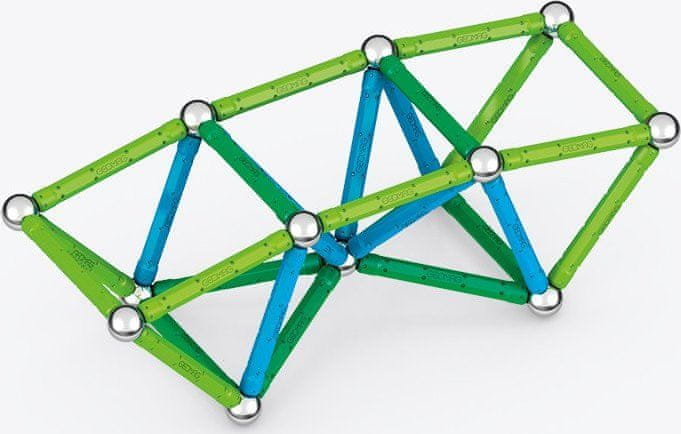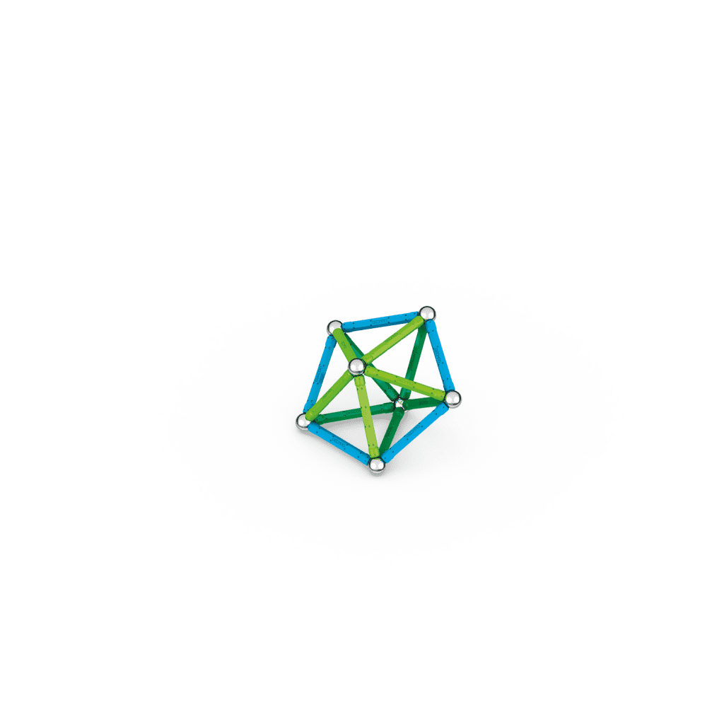 Magnetni komplet vsebuje: 28 magnetnih palic v kombinaciji modre, zelene in limetine barve 28 jeklenih kroglic, 2 modri kvadratni in 2 petkotni plastični podlagi v barvi limete