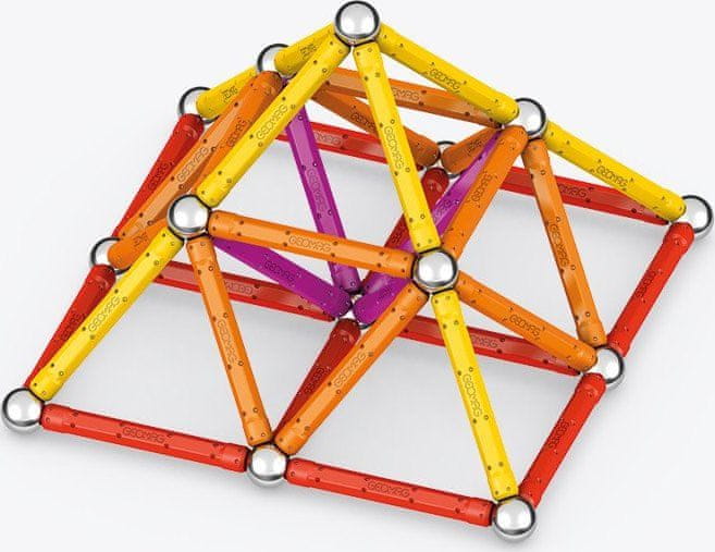 Magnetni gradbeni set Geomag Classic vsebuje skupno 93 kosov, ki omogočajo gradnjo različnih prostorskih struktur. V kompletu je 44 magnetnih palic v svetlih barvah – rumeni, oranžni, rdeči in vijolični, ki so izdelane iz 100 % reciklirane plastike. Te palice dopolnjuje 44 jeklenih kroglic, ki služijo kot pritrdilni elementi, in plastične podlage – dve rumeni kvadratni in tri oranžne petkotne. S temi elementi je mogoče ustvariti različne geometrijske oblike in strukture, ki so prikazane tudi na embalaži in na primerih sestavljenih modelov.