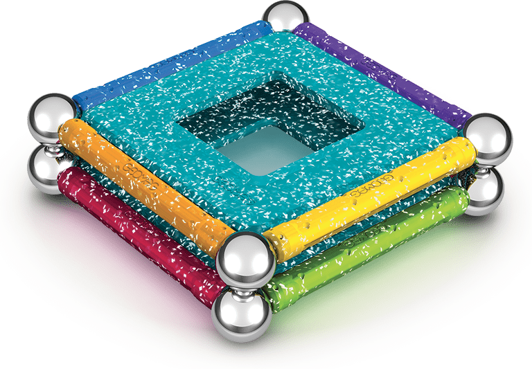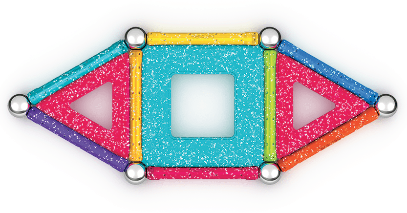 Magnetni komplet Geomag, ki vsebuje edinstvene bleščice v palicah in polnilih. Komplet je namenjen otrokom od 3. leta starosti dalje in je izdelan iz 100 % reciklirane plastike. Komplet vsebuje skupaj 22 kosov – 8 magnetnih palic, 8 jeklenih kroglic, 4 rdeča trikotna polnila in 2 modra kvadratna polnila. Poleg kroglic vsi deli, vključno s plastičnim ohišjem, vsebujejo bleščice.