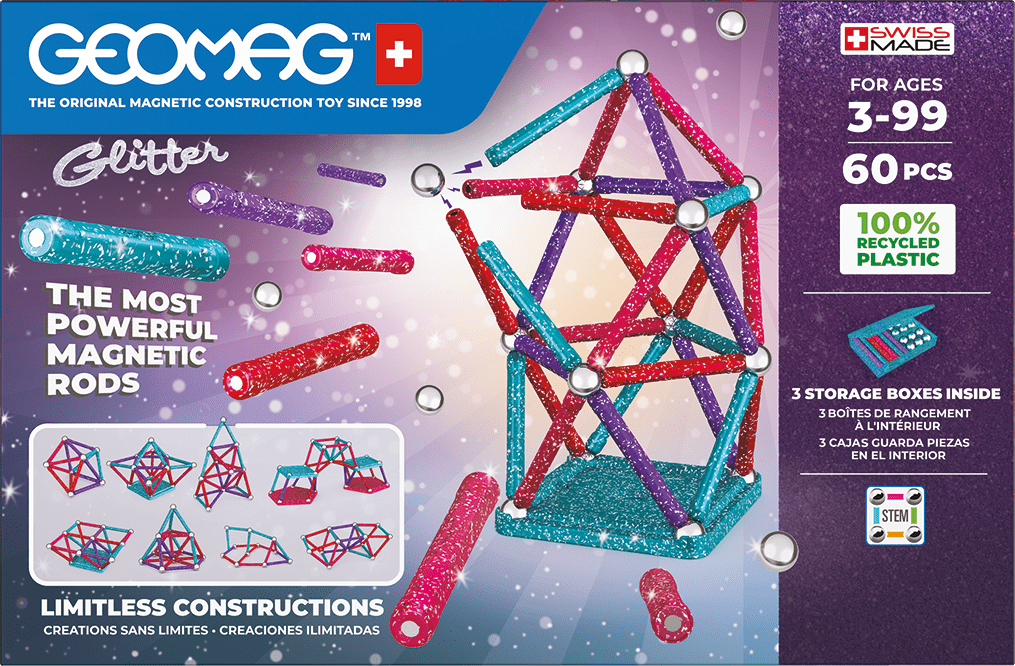 Geomag Glitter 60-delna različica je magnetni gradbeni set, ki otrokom in odraslim ponuja možnost ustvarjanja različnih tridimenzionalnih struktur. Glavni elementi so barvne magnetne palice, ki so izrazito okrašene z bleščicami, kar jim daje zanimiv vizualni učinek. Palčke dopolnjujejo bleščeče jeklene kroglice, ki služijo kot spoji ter omogočajo enostavno in trdno povezovanje posameznih delov. Priložena sta tudi dve modri kvadratni in dve rdeči petkotni podlagi, ki razširjata možnosti gradnje in zagotavljata stabilno podlago.