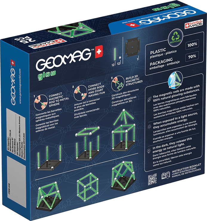 Pakiranje je praktično zasnovano, v njem pa je škatla za shranjevanje, ki omogoča enostavno shranjevanje vseh delov po končani igri. Zaradi kompaktne zasnove in kakovostne izdelave je komplet namenjen otrokom od 3. leta dalje, pa tudi starejšim uporabnikom do 99. leta starosti. Geomag Glow tako podpira razvoj ustvarjalnosti, logičnega mišljenja in fine motorike z zabavno in zanimivo obliko igre, ki ponuja neomejene možnosti za gradnjo različnih geometrijskih oblik in struktur.