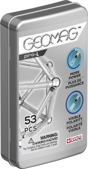 Serija Geomag Pro-L je bila ustvarjena posebej za graditelje velikih objektov. Njegova posebnost je ojačan magnet v palicah, zaradi katerega ne bo težav pri ustvarjanju res velikih konstrukcij. Kazalnik polarnosti je vedno poudarjen na ustreznem koncu palice. Zaradi pravilne polarnosti lahko svoje konstrukcije polirate do popolnosti! Srebrne palice in prozorna plastična polnila v modrih odtenkih so elegantna kombinacija. Komplet vsebuje: