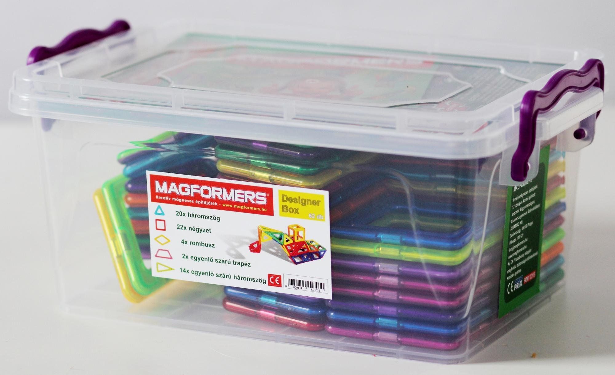 Designer Box je vsebinsko in cenovno enak klasični embalaži Magformers Designer, vendar so namesto enkratnega „darilnega“ paketa vsi kosi v praktični plastični škatli z odstranljivim pokrovom uporabljajte hkrati kot kovček za shranjevanje. Celoten opis