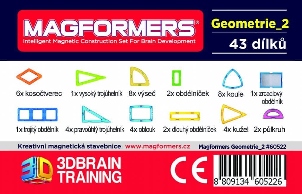 V škatli je priložen dodatni učbenik z navodili za otroke in starše. Celoten projekt izobraževalnih kompletov kartic Magformers se izvaja v sodelovanju z akreditirano predavateljico nadaljnjega izobraževanja učiteljev, RNDr. Marijo Kupčákovo, Ph.D. Geometrijske karte so sestavljene v skladu z veljavnim učnim načrtom, utrjujejo in razvijajo geometrijsko znanje učencev, hkrati pa sledijo trenutnim zahtevam po poenostavitvi poučevanja látky. Njena naloga je ponovno narediti učni načrt bolj privlačen in razviti geometrijsko znanje otrok o ravnini (2D geometrija) in prostoru (3D geometrija). Učne kartice Ravnina in prostor so gradivo, namenjeno neposredni podpori osnovnošolskim učiteljem ali staršem. Njihova vsebina ustreza trenutnim zahtevam za češke učence ob koncu 3. in ob koncu 5. razreda osnovne šole. Učne škatle Magformers so primerne za samostojno dejavnost učencev ali za delo na postaji. Če lahko za učilnico kupite več kot en komplet škatel, lahko učitelj dela frontalno s celotnim razredom. Z lahkoto lahko pripravijo predstavitev iz skeniranih kartic ali z uporabo vizualizatorja. Kartice vsebujejo minimalno besedilo, zato jih je mogoče uporabiti tudi pri izobraževanju otrok tujcev in v okviru inkluzije. Učne kartice so razdeljene na dve ravni: Osnovna šola 3 (svetlo oranžno ozadje številk strani) Osnovna šola 5 (temno oranžno ozadje številk strani) Primeri obravnavanih tem: Prepoznavanje lastnosti ravninskih likov in njihovo razvrščanje Osna simetrija Dopolnjevanje in konstruiranje ravninskih likov Prepoznavanje lastnosti in značilnosti prostorskih likov Ravninska simetrija Kubične strukture Iskanje mrež teles in njihovo dopolnjevanje