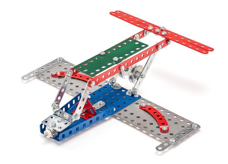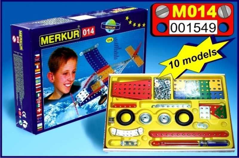 Klasični enoplastni komplet Merkur 14 – letalo. Komplet vsebuje dele, potrebne za izdelavo modelov letal. V kompletu je priložena knjiga z navodili za gradnjo 10 različnih modelov. Ta edinstveni komplet je idealen pripomoček za razvijanje otroških tehničnih spretnosti in domišljije. Komplet vsebuje kakovostne kovinske dele, ki jih je enostavno povezati z vijaki, kar spodbuja razvoj fine motorike, logičnega razmišljanja in koncentracije. Število kosov: 130. Pakirano v škatli. Dimenzije paketa: 18 × 26 × 5 cm. Ni primerno za otroke, mlajše od 3 let. 5+