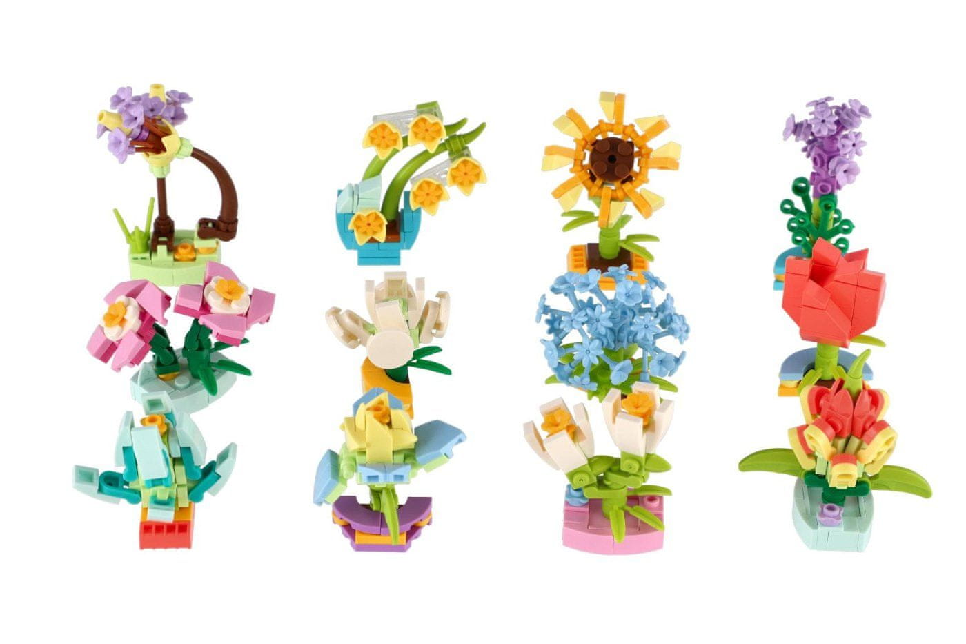 Set omogoča otrokom, da iz plastičnih delov sestavijo različne vrste rož. Vsaka roža je sestavljena iz več delov, priloženo je slikovno navodilo. Zaradi mešanice različnih vrst rož lahko otroci ustvarijo barvite in edinstvene cvetlične kombinacije. Komplet je odličen za razvijanje otroške domišljije in spretnosti, lahko pa se uporabi tudi kot darilo za male ustvarjalce. Velikost izdelka je 6 cm. Primerno za otroke od 3. leta starosti.