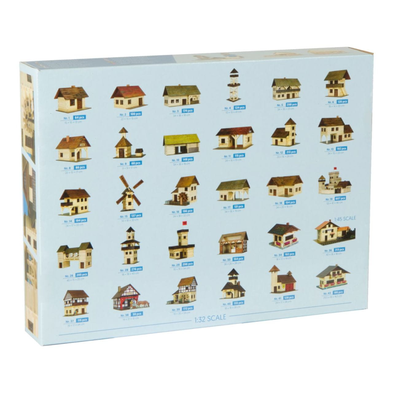 Velikost paketa: 29×21,7×4,7 cm Velikost planinske koče: 18×18×28 cm Starost: 8+ Material: les, karton Zahtevnost: lahka Število kosov: 135 kosov Izdelano na Češkem Celoten opis