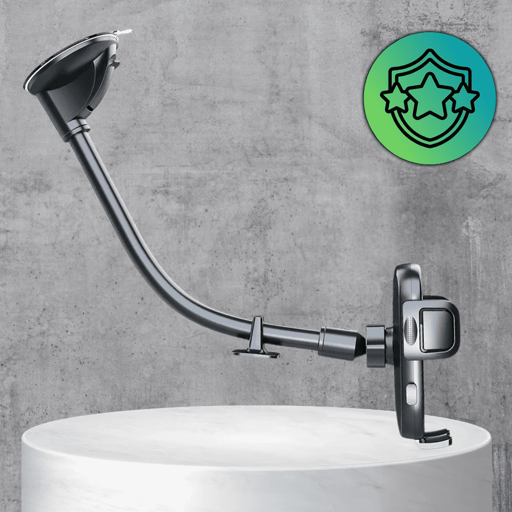 S trdnimi in udobnimi rokavi zagotavlja stabilnost med vsako vožnjo, stranski gumijasti elementi pa preprečujejo izpad in poškodbe telefona. Nosilec je zasnovan za ponavljajočo uporabo na steklu ali armaturni plošči in omogoča enostavno prilagajanje ter 360° vrtenje za lažji dostop do naprave.