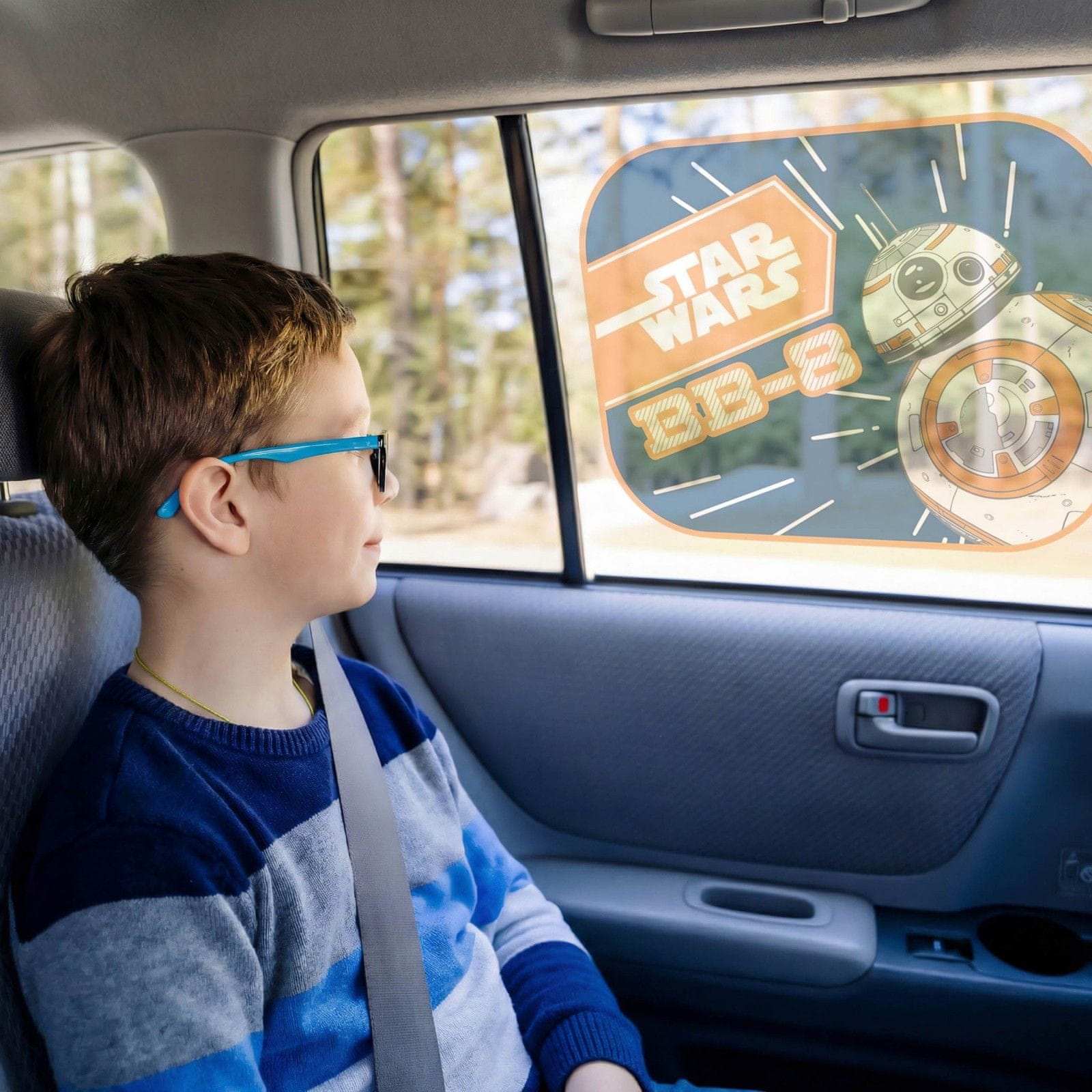Komplet avtomobilskih senčnikov z motivom BB-8 iz vesolja Vojne zvezd je praktičen in vizualno privlačen pripomoček za otroke.