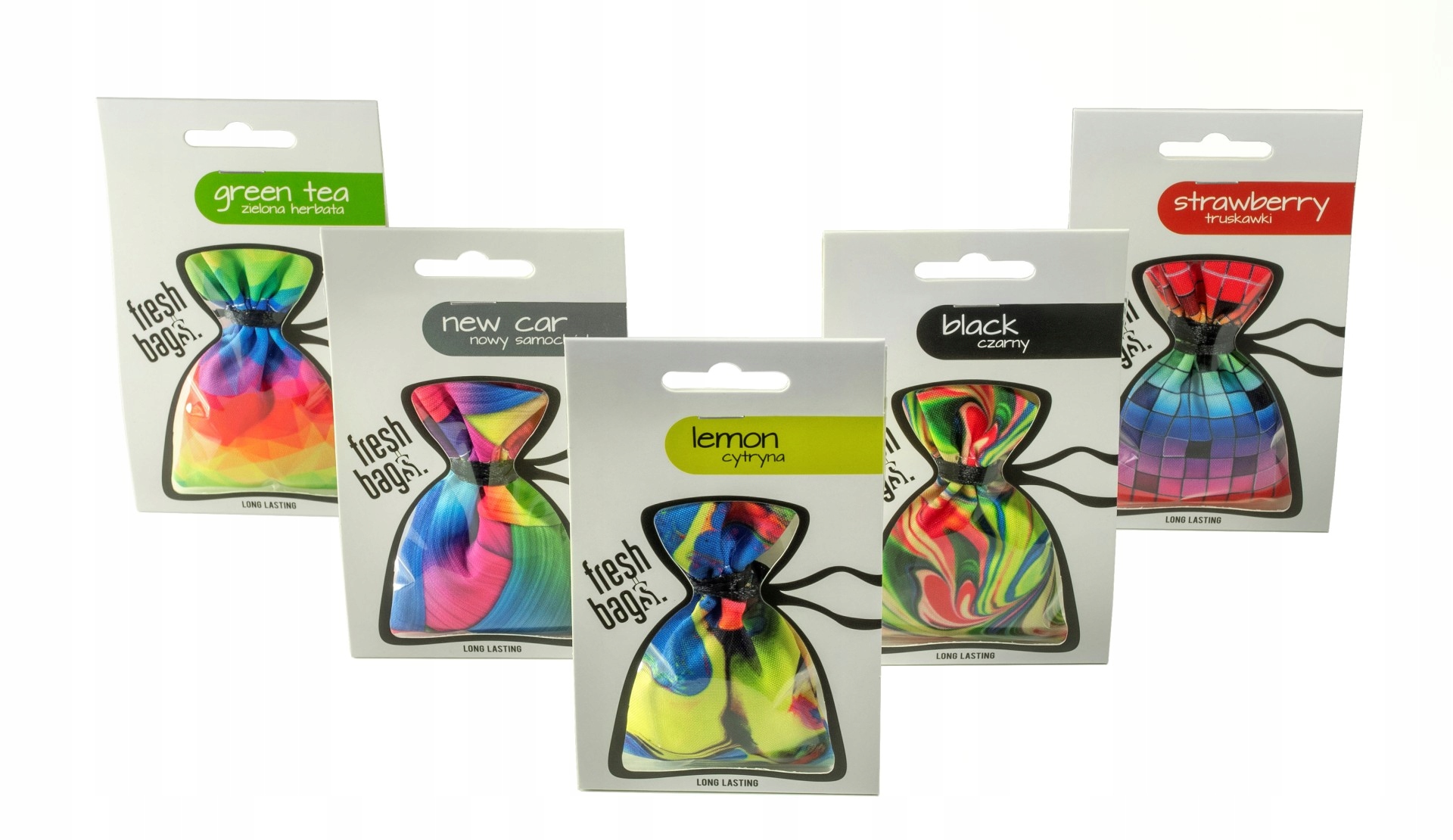 Vse dišave so skrbno izbrane dišavne kompozicije najvišje kakovosti. Širok izbor dišav pomeni, da bo vsak našel dišavno noto zase. Obstojnost dišave zagotavlja posebna tehnologija z uporabo dišavnih biserov, ki so dolgo obstojen in intenziven nosilec. Fresh torbe so na voljo v različnih stilih, tako da lahko vsak najde nekaj zase in se prilega notranjosti svojega avtomobila. Niti dve enaki torbi nista! Fresh bags osvajajo srca voznikov na Poljskem in v tujini!