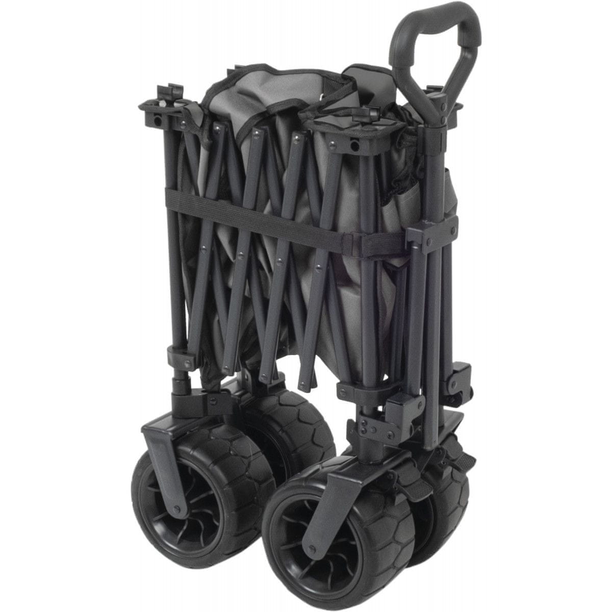 Zložljiv voziček z velikimi terenskimi kolesi brez problema premaguje vsak teren. Nastavljiv pokončni ročaj omogoča gladko krmiljenje. Robustni kovinski okvir in prostorna notranjost nudita obremenitev do 100 kg. Za še večjo uporabnost poskrbi odstranljiva zgornja ploskev, ki spremeni voziček v mizo. Stranski žepi nudijo še več prostora za prevažanje stvari.