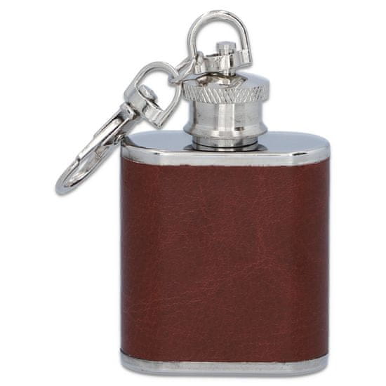 Klasična kovinska čutara s prostornino 30 ml, izdelana iz nerjavečega jekla in obrobljena z rjavim umetnim usnjem.