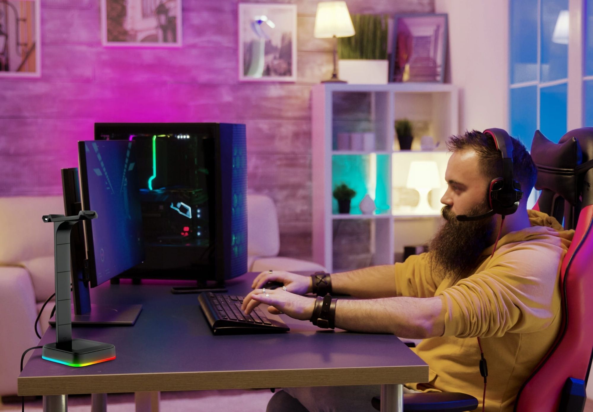 Povabite edinstveno vzdušje v svoje notranjosti! Naše stojalo za slušalke bo na vašo mizo prineslo večbarvno osvetlitev, ki jo lahko prilagodite svojim individualnim željam – utripajoče spremembe barv, enobarvne barve ali počasni prehodi – vse je odvisno od vas!
