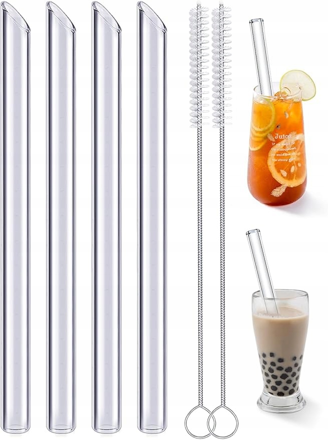 •      Poševne steklene slamice za večkratno uporabo Ta komplet poševnih steklenih slamic vsebuje 4 poševne steklene slamice in 2 čistilni krtački. Štiri slamice s premerom 14 mm in nekoliko širša steklena slamica zagotavljajo prijetnejšo izkušnjo pitja. Dolžina 21,5 cm omogoča uporabo v najrazličnejših posodah. Steklene slamice se ne deformirajo, so trpežne in primerne za večkratno uporabo.