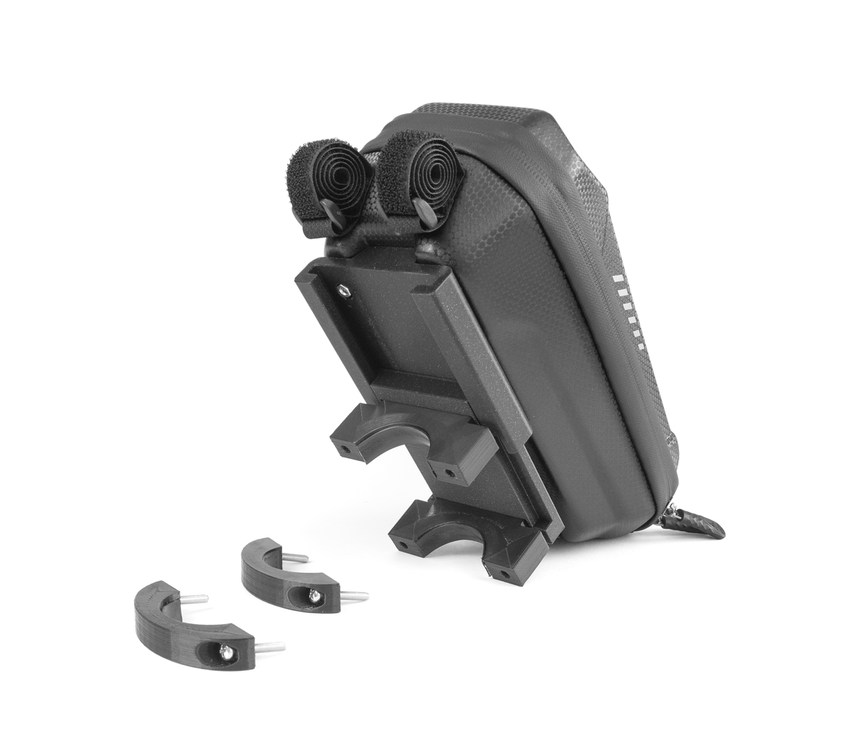 Dvojni sistem pritrditve zagotavlja večjo nosilnost in veliko večjo stabilnost v primerjavi z drugimi rešitvami, ki temeljijo na ježku/kabelskih vezicah, prostornina torbe pa vam omogoča, da prevažate veliko majhnih predmetov.