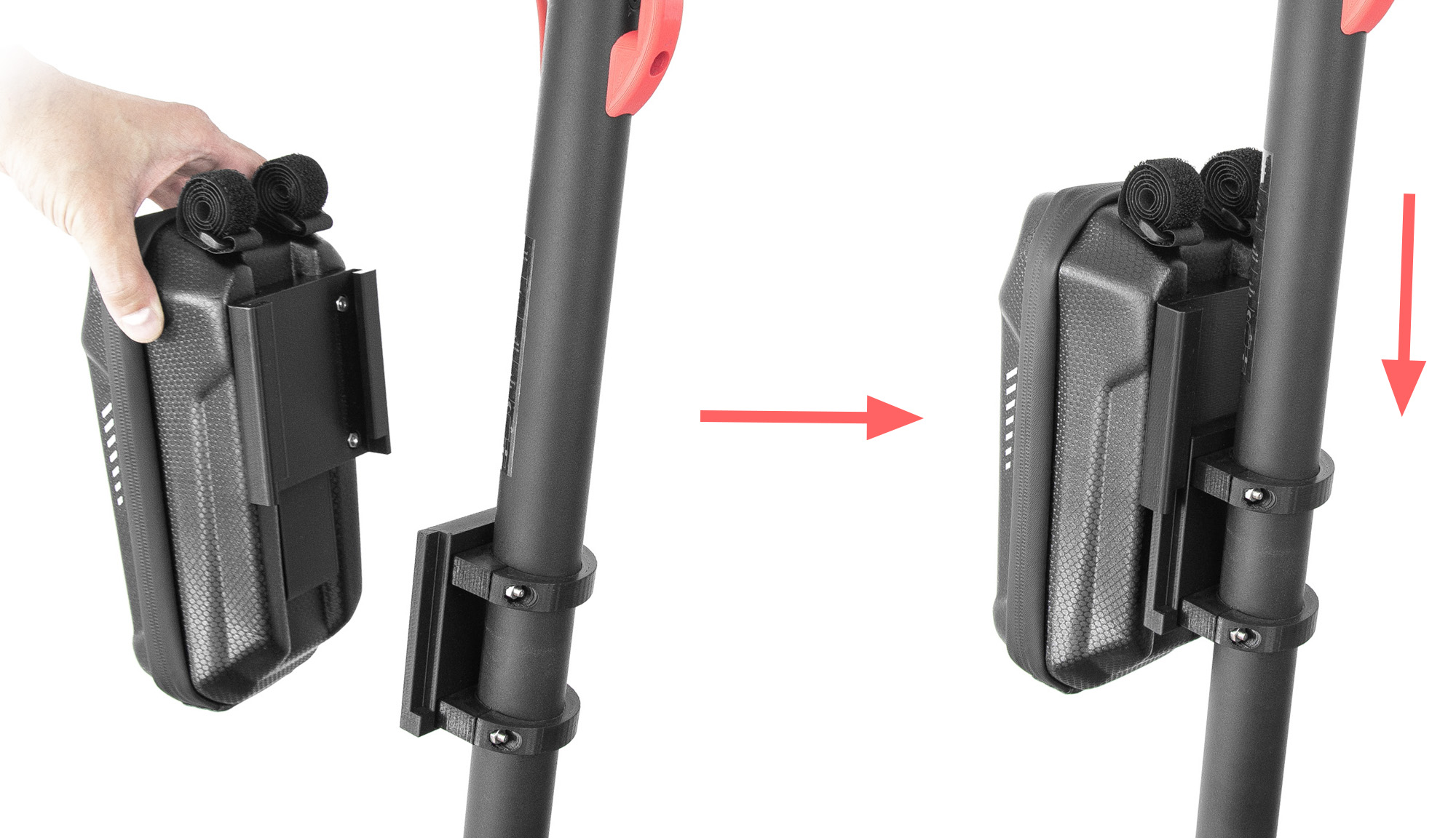 Dvojni sistem pritrditve zagotavlja večjo nosilnost in veliko večjo stabilnost v primerjavi z drugimi rešitvami, ki temeljijo na ježku/kabelskih vezicah, prostornina torbe pa vam omogoča, da prevažate veliko majhnih predmetov.
