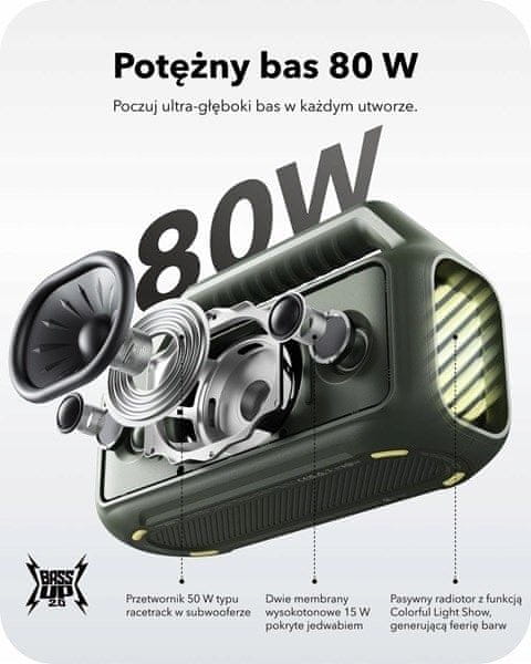 SOUNDCORE BOOM 2 je prenosni zvočnik, opremljen z najnovejšo tehnologijo Bluetooth 5.3, ki zagotavlja stabilno in hitro povezavo ter doseg do 10 metrov. Njegova prostornina RMS 80 W in širok frekvenčni razpon od 100 do 20.000 Hz omogočata vrhunsko kakovost zvoka, primerno za različne priložnosti.