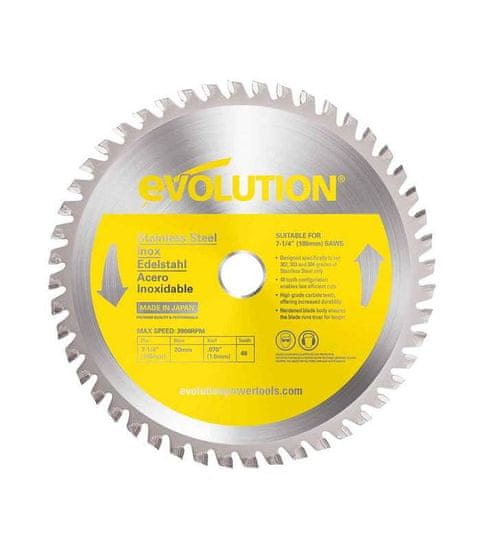 Evolution 180 mm rezilo z 48 zobmi za rezanje nerjavečega jekla. Žagini listi Evolution so zasnovani tako, da zagotavljajo največjo zmogljivost z uporabo karbida najvišjega razreda, utrjenih teles rezil in ultra visoko kakovostnih tehnik spajkanja. Celoten opis