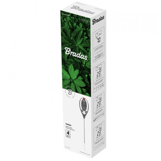 Merilnik pH tal za merjenje kislosti, vlažnosti, sončne svetlobe in temperature tal, 4 funkcije z jasnim LCD zaslonom in 20 cm kovinsko sondo. Izdelek potrebuje baterije (niso priložene). Vrtni pH meter meri 4 parametre: – merjenje sončne svetlobe; – merjenje kislosti tal; – merjenje vlažnosti tal; – merjenje temperature tal. Merjenje sončne svetlobe: 1. Vklopite merilnik, usmerite okence svetlomerja proti viru svetlobe. 2. Na zaslonu se bo prikazala raven svetlosti. Indikator LOW- pomeni najnižjo vrednost, indikator HGH+ pa najvišjo vrednost. Merjenje kislosti tal: 1. Stikalo na zadnji strani ohišja nastavite v položaj pH. 2. Sondo nežno in navpično vstavite v zemljo. Vklopite napravo. 3. Na zaslonu se bo prikazal pH reagent. 4. Za natančnejši rezultat meritve opravite več meritev. Odčitek pH 7 pomeni nevtralna tla. Odčitek pod pH 7 pomeni kisla tla, odčitek nad pH 7 pa alkalna tla. Če se prikaže »Lo« ali »HH«, to pomeni, da je merilno območje izven območja. Merjenje vlažnosti tal: 1. Stikalo na zadnji strani ohišja nastavite na OC. Sondo nežno in navpično vstavite v zemljo. 2. Vklopite napravo. 3. Rezultat meritve bo prikazan na zaslonu. 4. Za natančnejši rezultat meritve izvedite več meritev. DRY + označuje zelo suha tla, WET + pa zelo mokra tla. Merjenje temperature tal: Rezultat meritve temperature bo prikazan skupaj z meritvijo vlažnosti. Če sonda ni vstavljena v zemljo, bo prikazana temperatura okolice. Če se prikaže »Lo« ali »HH«, to pomeni, da je merilno območje izven območja.