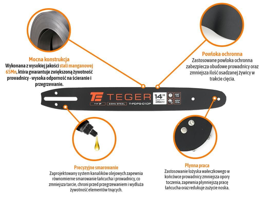 14" (36 cm) / 3/8" 1,1 mm 52 og / 7t / moč. Vodilo verige P / TEGER, vzdržljivo in natančno izdelano, zasnovano za verižne žage, ki jih uporabljajo tako profesionalni kot domači uporabniki. Zahvaljujoč visokokakovostnim materialom in trdni konstrukciji zagotavlja gladko in natančno delovanje verige, kar zmanjšuje tveganje pregretja in prekomerne obrabe. Zasnovan za uporabo z naslednjo verigo: T-LDPS-010 TEGER in z verigami drugih znamk, ki podpirajo nastavek P. Združljivo z verigami za polno dleto in polovično dleto. Pred nakupom preverite združljivost parametrov vodila z vašim modelom žage!