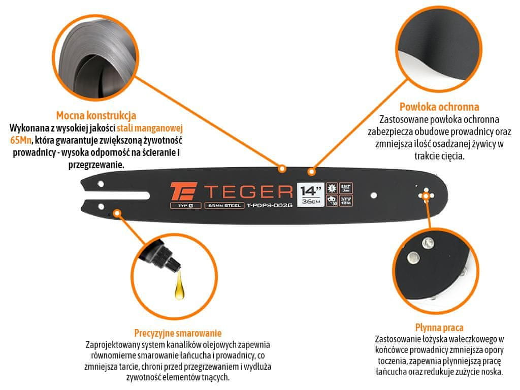 14" (36 cm) / 3/8" 1,1 mm 50 og / 9t / G / TEGER vodilo verige je vzdržljivo in natančno izdelano, zasnovano za verižne žage, ki jih uporabljajo tako profesionalni kot domači uporabniki. Zahvaljujoč visokokakovostnim materialom in trdni konstrukciji zagotavlja gladko in natančno delovanje verige, kar zmanjšuje tveganje pregretja in prekomerne obrabe. Zasnovan za uporabo z naslednjo verigo: T-LDPS-002 TEGER in verigami drugih znamk, ki podpirajo nastavek G. Združljivo z verigami za polno dleto in polovično dleto. Pred nakupom preverite združljivost parametrov vodila z vašim modelom žage!