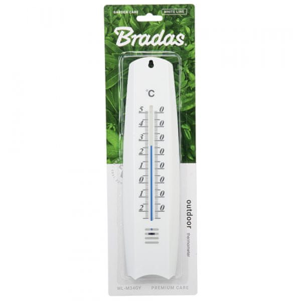 Tradicionalni zunanji termometer za merjenje temperature. Tehnični podatki:- Delovno območje: od –25 do 50 °C;- Skupna dolžina: 26 cm;- Nestrupeno na osnovi alkohola;- Glavno ohišje iz bele plastike;- Pritrdilne luknje na ročajih omogočajo pritrditev na steno ali okenski okvir;- Številke na skali so velike in enostavne za branje.
