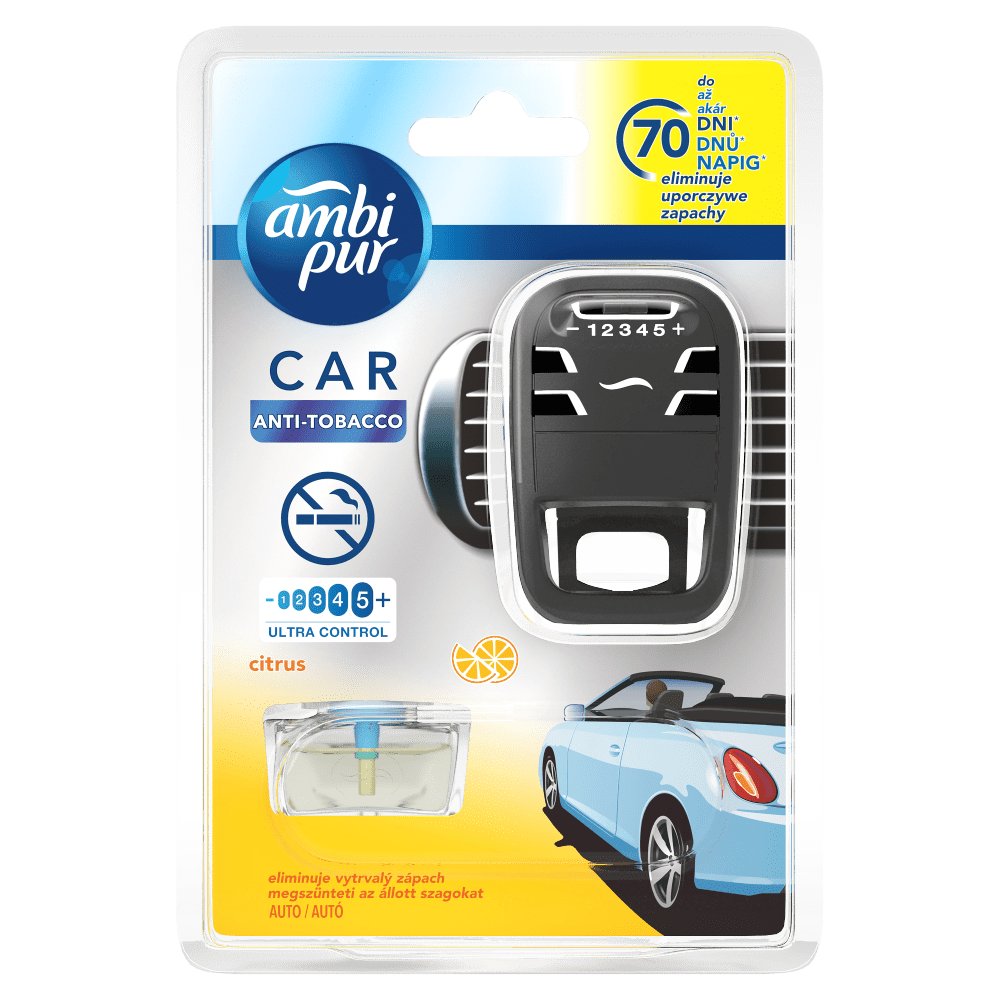 Osvežilec zraka za avtomobil Ambi Pur Car s tehnologijo OdourClear neprekinjeno čisti zrak trajnih vonjav in pušča lahek, svež vonj do 70 dni. Odstranjuje vonjave po tobaku z lahkim, svežim citrusnim vonjem. Za razliko od večine osvežilcev zraka za avtomobile, ki le prikrijejo vonjave, Ambi Pur Car popolnoma očisti zrak in pusti le čudovit, svež vonj. Gre za majhen, diskreten osvežilec zraka, ki ga enostavno namestite na prezračevalno odprtino vašega avtomobila. Zahvaljujoč novi, edinstveni tehnologiji OdourClear očisti zrak tudi najbolj trajnih vonjav – kot so hrana, hišni ljubljenčki, cigaretni dim ali smeti – in osveži notranjost avtomobila. Intenzivnost vonja lahko prilagodite z nastavitvijo želene nastavitve na stranskem gumbu. Osvežilec zraka za avtomobil Ambi Pur Car je enostaven za uporabo in ne potrebuje baterij ali elektrike. Zdrži do 30 dni, tako da si lahko vi in vaši gostje oddahnete. Odkrijte celotno paleto novih izdelkov Ambi Pur z edinstveno tehnologijo OdourClear, kot so osvežilci blaga (ki odstranjujejo vonjave z avtomobilskih sedežev) ali osvežilci zraka za majhne prostore v vašem domu. Preizkusite tudi osvežilce zraka 3Volution z vtičnico, ki neprekinjeno odstranjujejo vonjave do 90 dni.