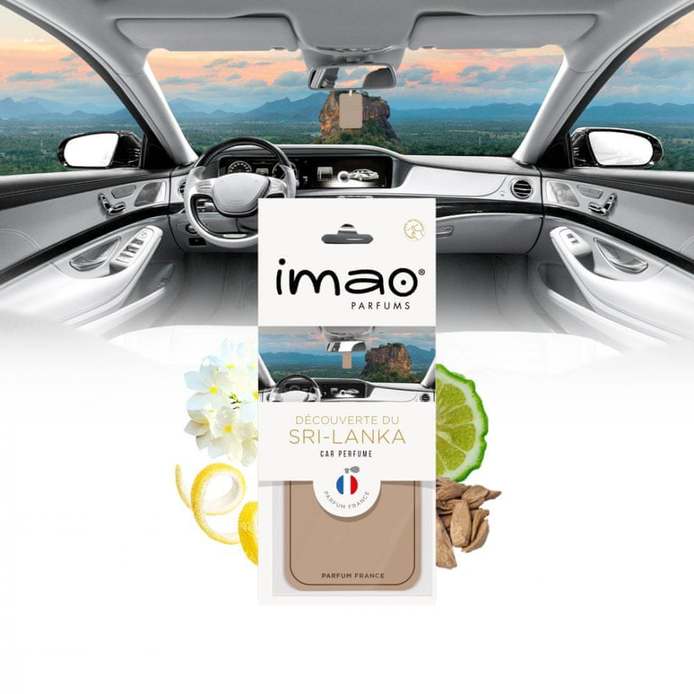 Osvežilnik zraka Imao CAR PERFUME „Découverte du SRI-LANKA“ vas bo s svojim očarljivim vonjem z notami bergamotke, mandarine, limone, vrtnice, jasmina in sandalovine popeljal na sončne plaže priljubljenega vzhodnoazijskega otoka.