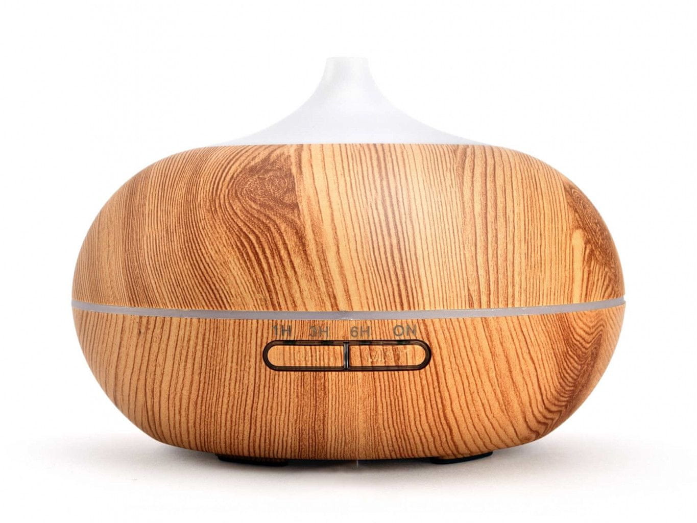Vlažilec zraka z difuzorjem v naravnem lesenem dizajnu (imitacija lesa). Aromatizira in vlaži zrak s kombinacijo učinkov vodne meglice in eteričnih olj. Z nežnimi ultrazvočnimi valovi razbije eterična olja v izjemno majhne mikrodelce, ne da bi jih segreval. Olja tako ohranijo svojo prvotno aromo in zdravilne lastnosti. Aroma difuzor vam bo pomagal ustvariti dišečo oazo v vsakem prostoru in ustvariti sproščujoče vzdušje. Aroma difuzor brez dodatka eteričnega olja služi kot vlažilnik zraka. Z dodatkom določenega eteričnega olja lahko sebi ali svojim bližnjim pomagate pri različnih boleznih. Že nekaj kapljic kakovostnega olja lahko olajša prehlad, kašelj, glavobol ali slabo spanje. Pravo olje bo očistilo zrak ali pa preprosto poskrbelo, da bo v prostoru, v katerem se nahajate, bolj prijetno. Zaradi nevtralne zasnove iz svetlega naravnega lesa bo stilsko dopolnil opremo vseh bivalnih prostorov, otroških sob, sejnih sob, masažnih salonov, wellness centrov itd. Z ustreznimi eteričnimi olji lahko spodbudite sproščujoče vzdušje v spalnici, razkužite zrak ali poskrbite za miren spanec v otroški sobi. Koncentracija v študentski sobi ali sproščena komunikacija doma ali v delovnem okolju. Vedno uporabljajte kakovostna olja. Z uporabo poceni umetnih olj lahko ustvarite dišeče okolje, vendar se telo in um ne bosta spočila. Nasprotno, lahko škoduje občutljivim osebam. Na primer glavoboli itd. Med delovanjem aroma difuzorja lahko poljubno in preprosto nastavite svetlobne učinke, ki bodo v prostoru ustvarili zelo prijetno okolje in sproščujoče vzdušje. Aroma difuzor je primeren povsod, kjer zaradi varnosti ni mogoče uporabiti odprtega ognja (sveče v aroma svetilkah). Združuje učinke vodne meglice in eteričnih olj. Delovanje aroma difuzorja je zelo preprosto. V rezervoar natočite vodo, po možnosti destilirano. Kapnite nekaj kapljic eteričnega olja in vklopite napravo s pritiskom na gumb MIST. Glede na število pritiskov na gumb lahko nastavite, koliko časa bo naprava delovala. Aroma difuzor takoj začne ustvarjati vodno meglico in razpršiti olje v zrak. Z gumbom LIGHT nastavite način barvne osvetlitve ozadja. S prvim pritiskom nastavite način samodejnega spreminjanja barv. Z dodatnimi pritiski lahko nastavite 8 barv v intenzivnejši ali svetlejši različici, ki ostanejo nastavljene, dokler naprava ne deluje, dokler jih ne spremenite. Svetlobni učinek lahko izklopite tako, da držite pritisnjen gumb LIGHT. Količine vode v rezervoarju vam ni treba preverjati. Po izpraznitvi se aroma difuzor sam izklopi.