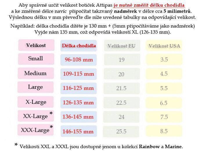 Obutev Attipas je primerna za otroke od 6 mesecev do 3 let. Obutev je namenjena otrokom, ki šele začenjajo hoditi, pa tudi dobrim sprehajalcem. Obutev Attipas je izjemno mehka, prilagodljiva in sledi obliki otrokovega stopala ter tako omogoča naravni razvoj otroških stopal.