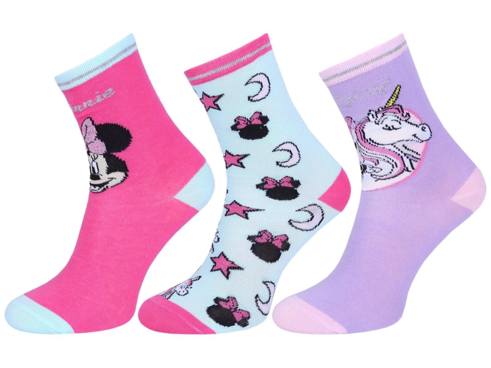 Tri pari nogavic v roza, mint in vijolični barvi z motivi Minnie Mouse in samoroga.