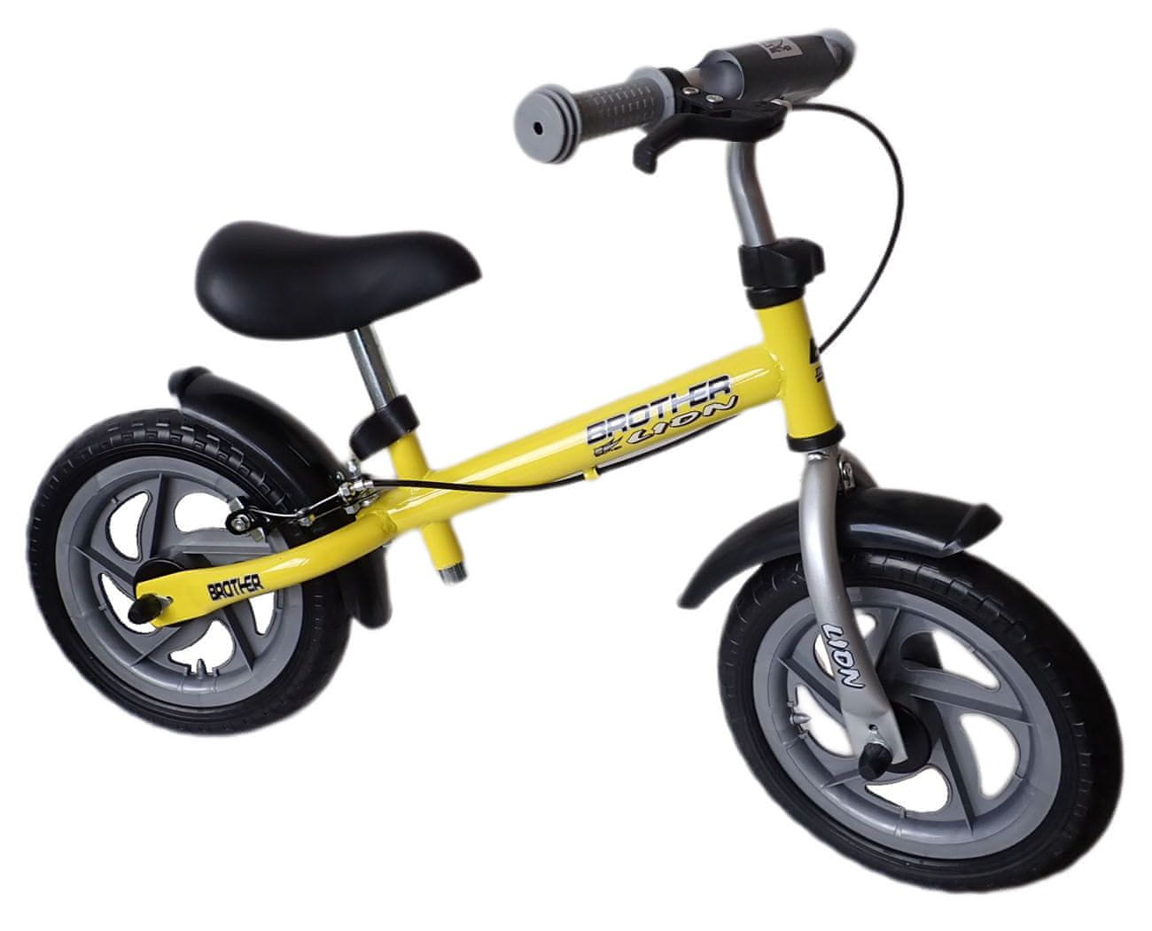 Otroški odbijač Brother Lion. Priporočljivo od 3. leta starosti, nosilnost do 40 kg, teža 5,5 kg. Hi-tech ojačan jekleni okvir, ravno ogrodje, ena ročna zavora. 12" + 12" plastične pnevmatike s penastim oblazinjenjem. Na zadnjem kolesu je ena ročična zavora. Nastavljiva višina sedla od tal je 38–45 cm, višina krmila pa 54–56 cm. Uporablja se za vožnjo in učenje osnov ravnotežja za prihodnje kolesarjenje. Na voljo v rumeni barvi.