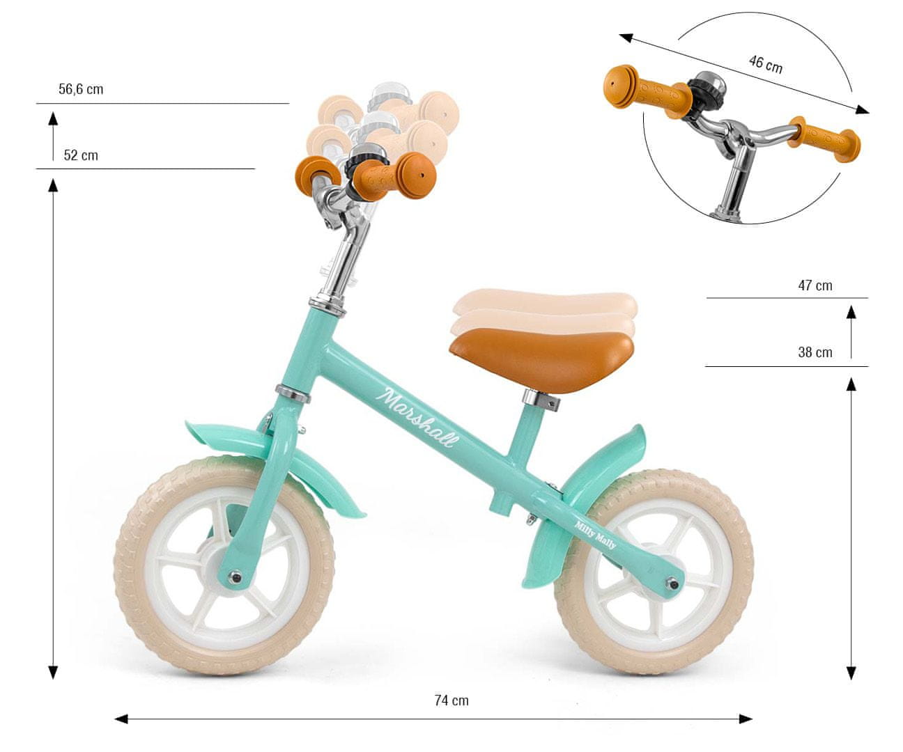 ZAKAJ STARŠI IZBEREJO KOLESA MILLY MALLY? Sodoben dizajn v kombinaciji z originalnimi vzorci in barvami naredi ta kolesa drugačna od tistih, ki so na voljo na trgu. Kolesa Milly Mally ponujajo predvsem varnost. Milly Mally je dolgoletni vodilni proizvajalec poganjalskih koles. Zakaj se splača začeti učenje vožnje vašega otroka s kolesom Marshall znamke MILLY MALLY? Ergonomska oblika kolesa zagotavlja neprimerljivo udobje in pravilno držo med vožnjo. Široka 10-palčna kolesa iz pene EVA dobro absorbirajo udarce, kar poveča udobje vožnje. Jeklen okvir – primeren za intenzivno uporabo mladega kolesarja. Prednosti poganjalcev: Učenje vožnje poganjalca odlično razvija ravnotežje in motorično koordinacijo. Je tudi odličen začetek pred vožnjo s tradicionalnim kolesom. Pomembno! Pri izbiri poganjalca za otroka moramo biti pozorni na položaj otrokovih nog. Za udobno vožnjo poganjalca mora imeti otrok celotno stopalo na tleh, noga pa mora biti med sedenjem rahlo pokrčena v kolenu. Najmanjša potrebna razdalja od sedeža do tal mora biti manjša od dolžine otrokove noge. Zakaj MARSHAL? Trpežne pnevmatike na belih platiščih, izdelane iz pene EVA, so trpežne in ne potrebujejo polnilnega tlaka. Ergonomski sedež z mehkim polnilom in nastavljivo višino omogoča, da kolo raste z otrokom. Marshall ima vrtljiv ročaj s krogličnimi ležaji in nastavljivo višino. Nedrseči, mehki gumijasti ročaji zagotavljajo varen oprijem in udobno vožnjo. Enostavno upravljanje. Klasična in ergonomska oblika kolesa zagotavlja vzdržljivost in udobje. Jeklen okvir zagotavlja večjo odpornost na preobremenitev. To kolo je primerno za dolgotrajno uporabo s strani … najmlajši kolesarji. Značilnosti izdelka: 10-palčna penasta kolesa, nastavljiva višina sedeža (38–47 cm), nastavljiva višina krmila (52–56,6 cm), trden okvir, nedrseči ročaji, udoben mehak, oblikovan sedež, kolesa s krogličnimi ležaji, starostna skupina 2–5 let, izpolnjuje evropske varnostne standarde. Tehnični podatki: dolžina od zadnjega do sprednjega kolesa: 74 cm, nastavljiva višina krmila: 52–56,6 cm, širina krmila: 46 cm, nastavljiva višina sedeža od 38 do 47 cm, največja nosilnost: do 20 kg, teža: 3,15 kg. Dimenzije embalaže: višina: 35 cm, širina: 15 cm, dolžina: 63 cm, bruto teža: 3,68 kg.