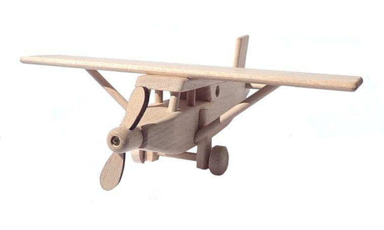 Leseni model letala je izdelan iz kakovostnega bukovega lesa. Njegova površina je le voskana in polirana, ni kemično obdelana ali na kakršen koli način pobarvana, da se ohrani naravni videz. Leseno letalo ima vrteče se propelerje in kolesa ter nima ostrih robov. Primerno je tudi za peskovnik. Glavne značilnosti.