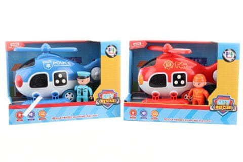 Helikopter na baterijski pogon. Material plastika. Napajanje z baterijami 3×AG13 (priložene). Helikopter oddaja zvoke letenja in hupanja. Pakiran v odprti škatli. Dimenzije paketa približno 21×15×12 cm. 2 barvi – dobavljamo glede na razpoložljivost na zalogi. Starost 3+