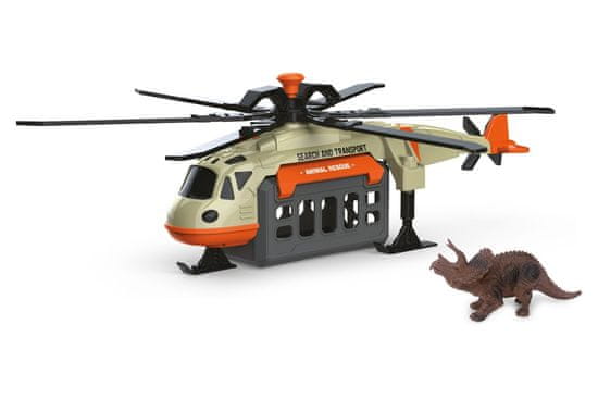 Helikopter z dinozavrom in učinki. Mere helikopterja 39×11,5×16 cm. Na vztrajniku. Svetlobni in zvočni učinki. 3×AG13 priložene baterije. Območje obremenitve se sprosti z oranžnim gumbom na propelerju.