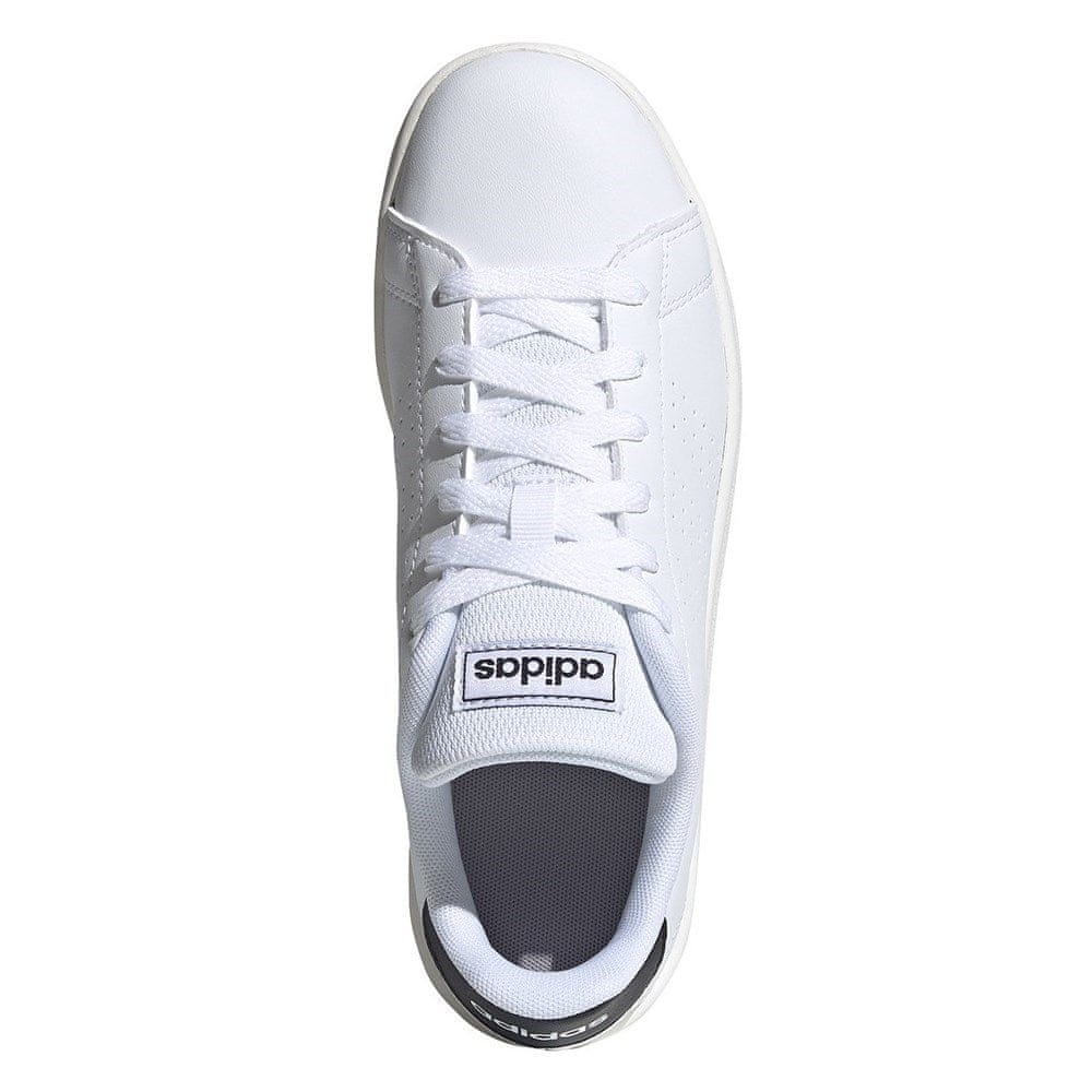 Elegantni čevlji adidas ADVANTAGE K so bele barve in imajo ob strani perforirane tri črte, ki predstavljajo adidas. Na jeziku in peti imajo napis adidas. Primerni so za prosti čas. Material: sintetično usnje, guma