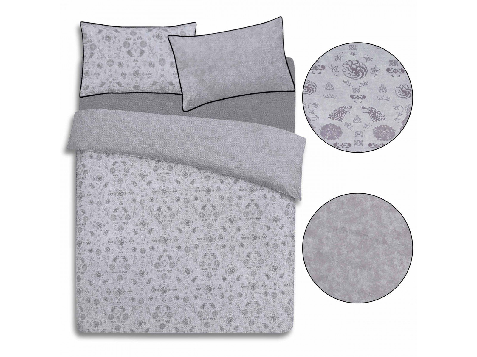 Siv komplet posteljnine z ponavljajočimi se simboli iz filma „Igra prestolov“.