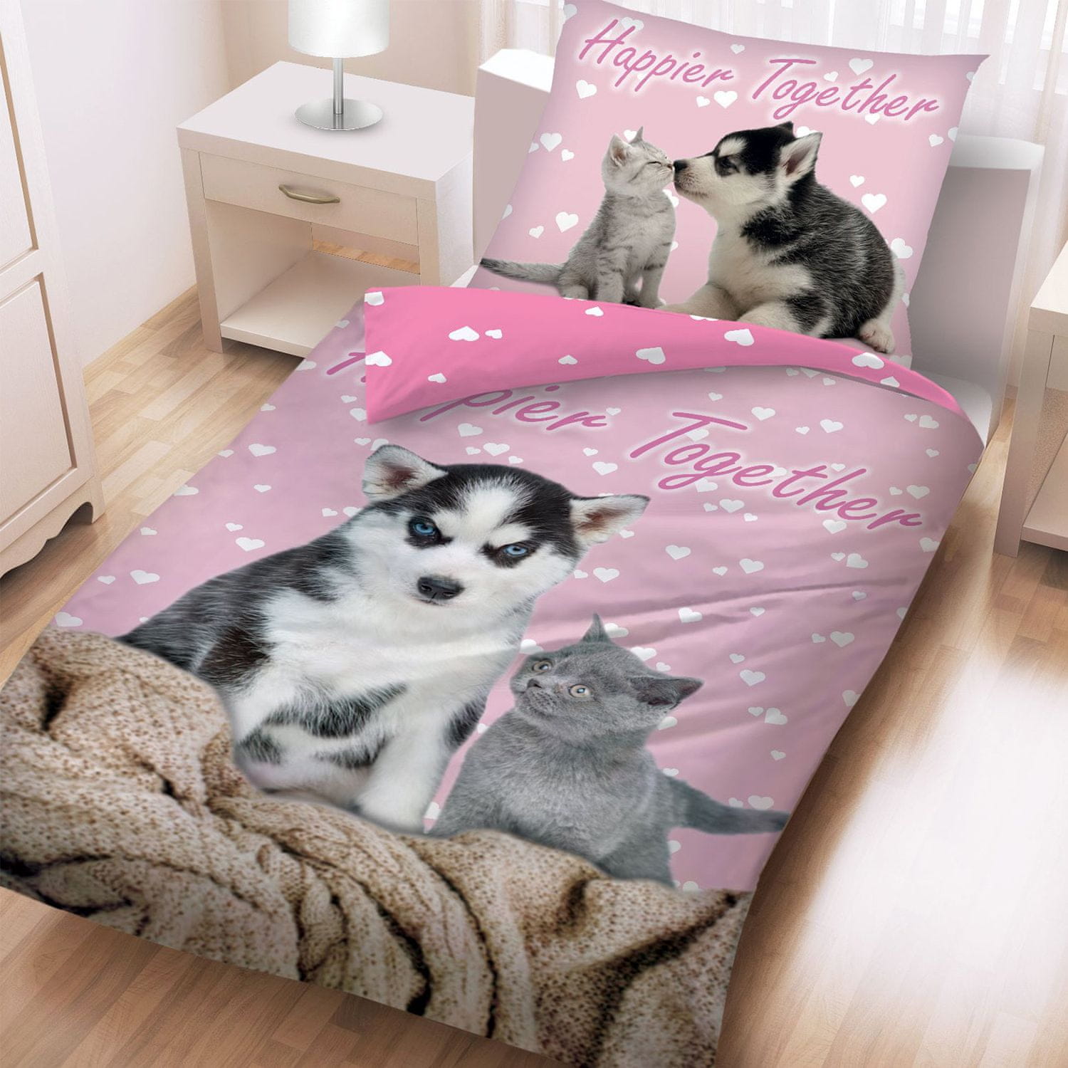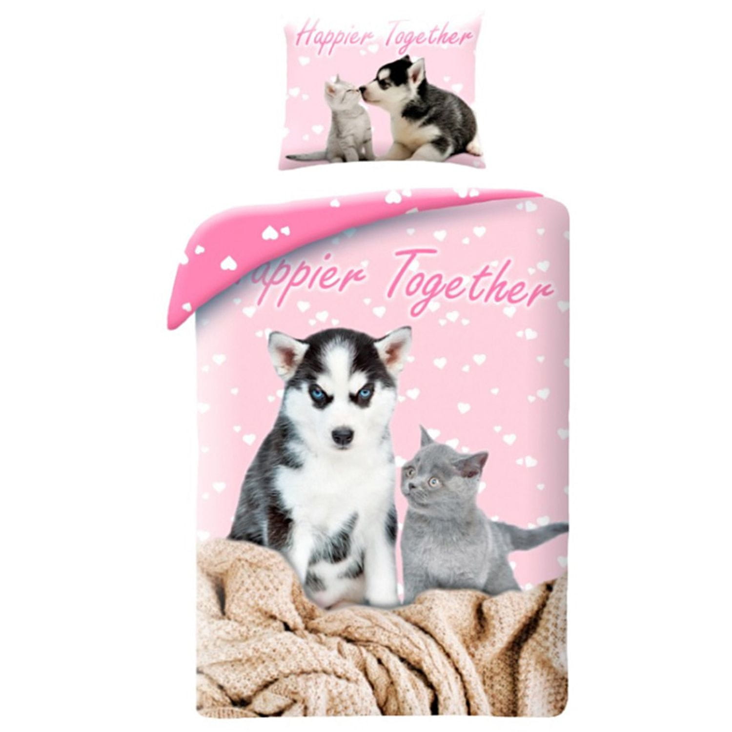 Posteljnina vesela Kužek in muca je izdelana iz kakovostnega bombaža, ki zagotavlja udobnost in trajnost. Posteljni set vsebuje prevleko za vzglavnik in odejo v velikosti 140×200 cm. Celoten opis