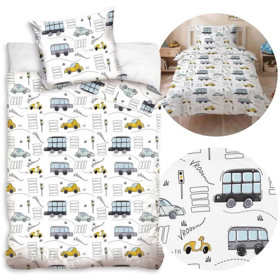 Ta vesela posteljnina z motivom avtomobilov, avtobusov in semaforjev je odlična izbira za vse male ljubitelje avtomobilizma.