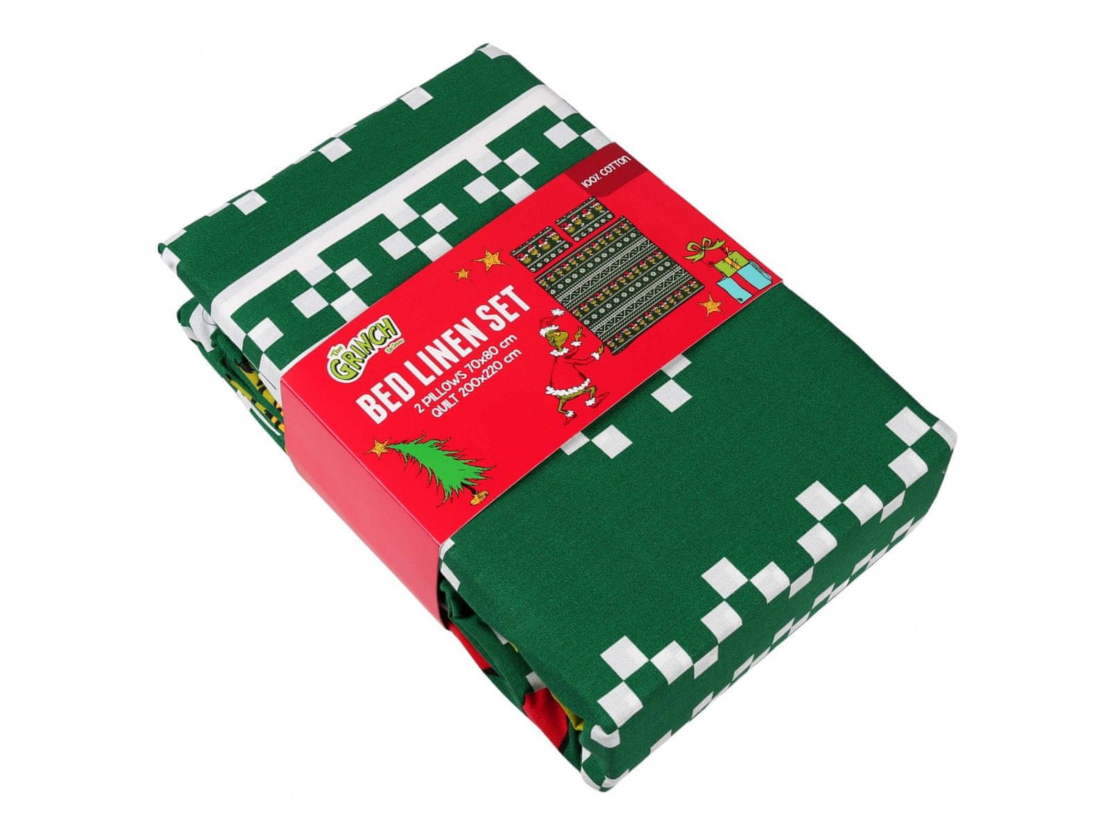 Komplet posteljnine v božičnem slogu, okrašen z motivom priljubljenega lika Grinch z Božičkovo kapo na zelenem ozadju.