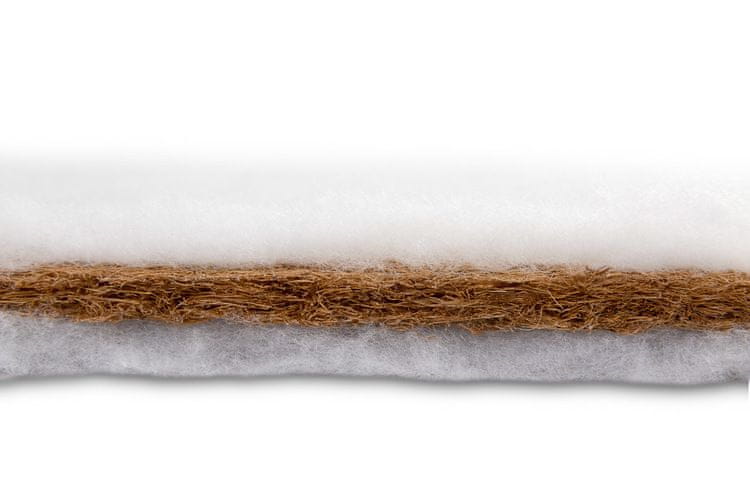 Polnilo ležišča je sestavljeno iz kokosove podloge, ovite v puhasto volno. Ta kombinacija zagotavlja ustrezno podporo otrokovi hrbtenici in zagotavlja visoko raven udobja. Prevleka je izdelana iz mehkega, na otip prijetnega in zračnega poliestrskega pletenega materiala. Če se umaže, lahko prevleko odstranite in operete.
