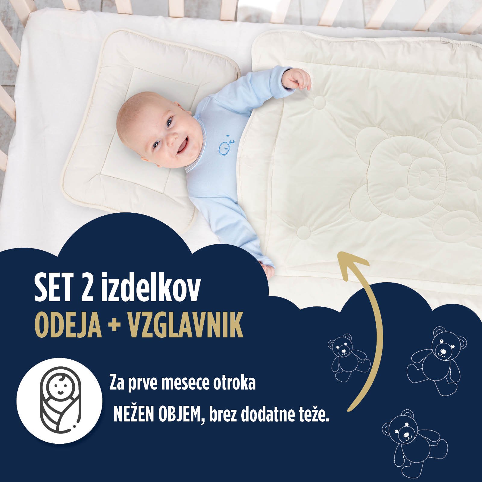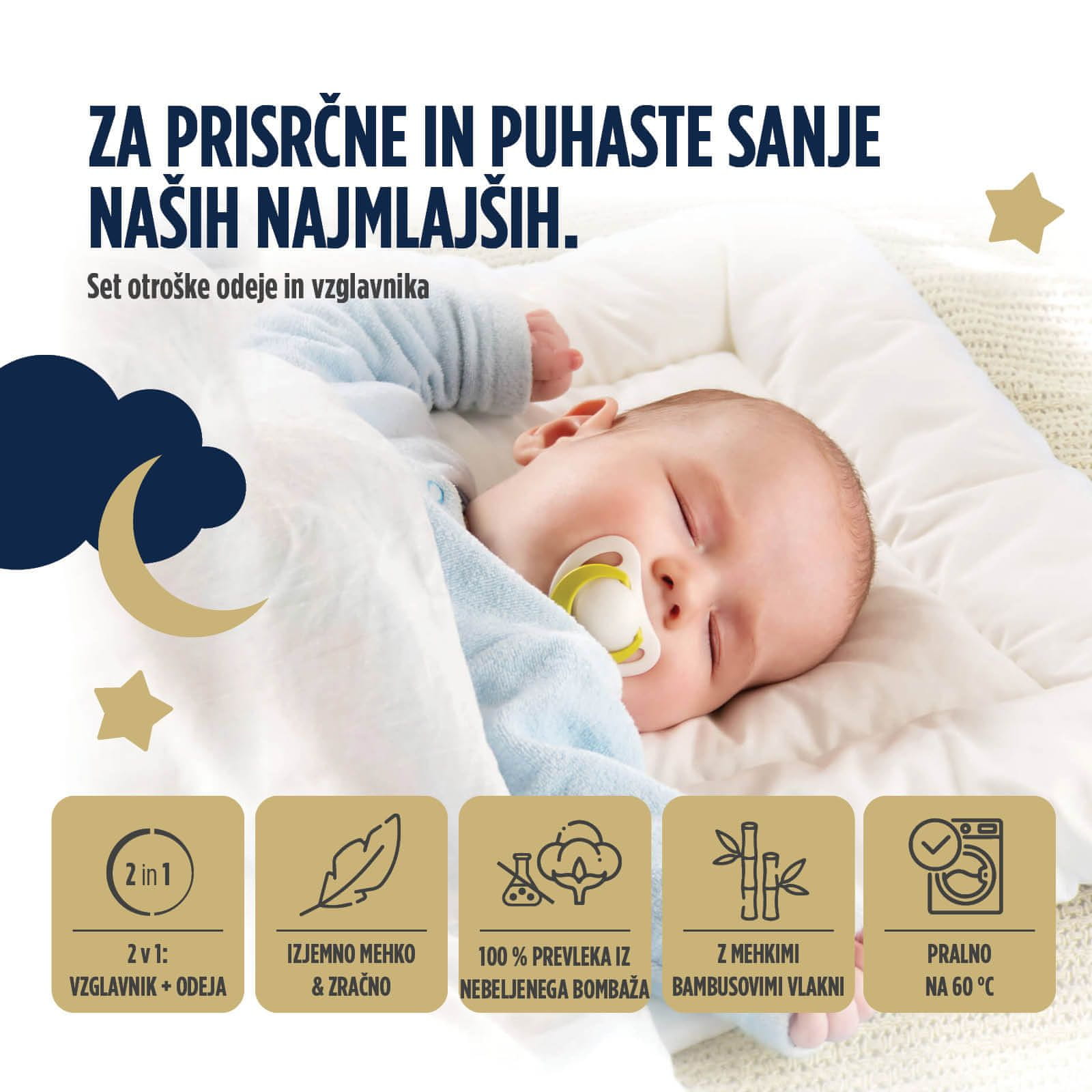Nizek in mehak vzglavnik nudi odlično podporo otroški glavici, mehka odeja pa je izjemno nežna in neškodljiva, saj izbrani materiali vpijajo odvečno vlago.