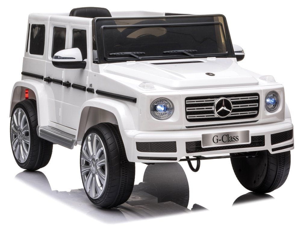 Akumulatorski Mercedes G500 Otroška baterijska različica Mercedesa G500 bo odlično darilo za vsakega najstnika, ki se rad igra z različnimi avtomobili. Zakaj se splača izbrati Mercedes G500? Priporočamo ga zaradi: – uradne licence Mercedes-Benz Daimler AG, – surovega dizajna, ki se nanaša na videz mercedesa G500 v polni velikosti, – kombinacije udobja vožnje z varno igro, – napajanja s kakovostnimi komponentami, – raznolikost v obliki zvočne plošče ali LED osvetlitve. Mercedes je prava kombinacija trdnosti, vrhunske kakovosti in bogatega dizajna. To vozilo se bo dobro obneslo tako med vsakodnevnimi izleti po posestvu kot med vikend izleti izven mesta. Dva motorja z močjo po 45W v kombinaciji z baterijo 12V7Ah, ki se nahaja „pod pokrovom“, omogočata vožnjo s hitrostjo od 3 do 5 km/h, kar bo zagotovo navdušilo ne le malega voznika, ampak tudi mimoidoče. V mercedesu je mehak kavč, oblečen s prešitim eko usnjem in nastavljivimi varnostnimi pasovi. Armaturna plošča ima vrtljiv volan z logotipom s trikrako zvezdo, imitacijo kazalnikov, vključno z merilnikom hitrosti in vrtljajev, ter glasbeno ploščo z USB ali MP3 vhodom. Ta rešitev bo naredila vsako potovanje bolj prijetno, saj se bo vaš malček počutil kot v pravem avtomobilu. Ogromen Mercedes G500 bo uresničitev sanj vsakega mladostnika – prepričani smo, da bo všeč tudi njegovim staršem in starim staršem. Upravljanje vozila je izjemno preprosto. Samo pritisnite gumb za zagon, primite volan in pritisnite gumb za plin. Pripravljeno je, lahko gre naprej. Če pa želite pomagati svojemu malčku, uporabite 2.4G daljinski upravljalnik, ki je priložen v kompletu, zahvaljujoč kateremu boste lahko prevzeli popoln nadzor nad vozilom in tako svojemu malčku prinesli veliko veselja. Mercedes G500 ima CE certifikat in je izdelan iz certificiranih materialov. Električni avtomobil bo narisal nasmeh na obraz vsakega malčka. Teža z embalažo: 18,4 kg Dimenzije embalaže: 103 cm x 57 cm x 46 cm