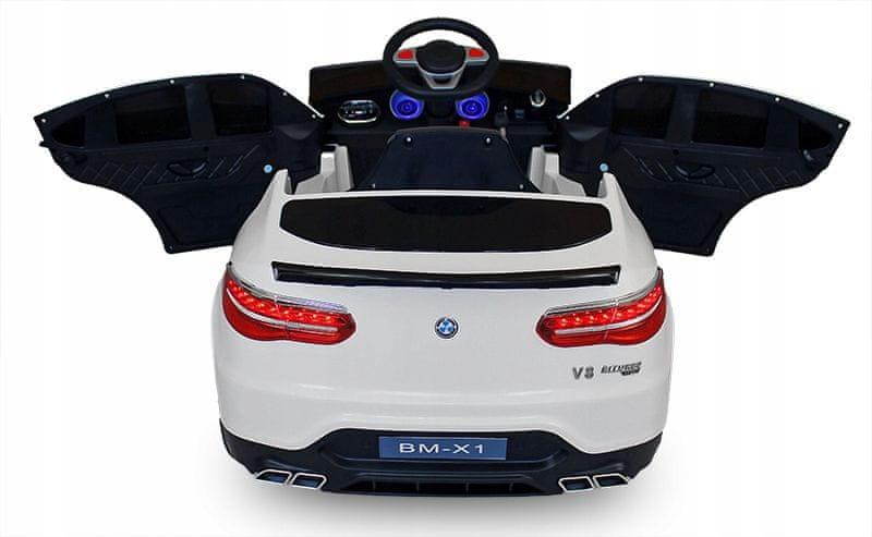 OTROŠKI AVTO JUST DRIVE CABRIO BM-IX1 BEL S POGONOM NA 2 KOLESNI VOZILI, NA BATERIJE + DALJINSKI UPRAVLJALNIK Popolno vozilo za vašega otroka! Električni avtomobilček kabriolet z 2,4G daljinskim upravljalnikom za starše. Veliko zabave in neverjetnih čustev! Odlična ideja za darilo! GLASBA + HUPA + PRIKLJUČEK ZA MP3 + 2,4G DALJINSKI UPRAVLJALNIK + LED LUČI Glavne značilnosti: Daljinsko upravljanje s priloženim daljinskim upravljalnikom Otrok lahko upravlja avtomobil z volanom, pedalom za plin in gumbom za vožnjo Odpiranje vrat x 2 Sprednja in zadnja osvetlitev vozila Obsežna glasbena plošča Sodoben dizajn Daljinsko upravljanje Odpiranje vrat (na obeh straneh) Neverjetni LED svetlobni učinki!! Zahvaljujoč daljinskemu upravljalniku lahko vozilo upravljate, medtem ko je vaš otrok v notranjosti, ali pa to stori sam izza volana. Vozilo je namenjeno uporabi na prostem, lahko pa se uporablja tudi v večjih prostorih, na terasi ali v dnevni sobi. Popolno za otroke, stare od 1 do 5 let. Hupa in glasba, ki ju upravlja otrok, in glasba z volana. Značilnosti: daljinski upravljalnik, ultra mehak, udoben sedež, avtomobilček za zagon s ključem, dodatni rezervni ključ, indikator napolnjenosti baterije, regulacija glasnosti, priključek za MP3, 12V baterija(e), stikalo za vklop, polnilnik (vhod 220–230V), varnostni pasovi, svetleče sprednje in zadnje luči, neverjetni LED svetlobni učinki, stikalo za vklop/izklop LED luči, melodije in hupa na volanu, odpiranje vrat, zaklepanje vrat, zvok zagona motorja; Vgrajeni plastični trakovi za kolesa (za zaščito tal), amortizerji, 2 stranski ogledali, pedal za plin, Specifikacije vozila: baterija/baterije s skupno močjo 12V DC 6V4,5AH, 2 motorja z močjo 30 W vsak, dimenzije vozila: 116×70×55 (DxŠxV v cm), dve hitrosti vozila: 3–6 km/h, teža vozila/paketa: 11/15 kg, povprečni čas vožnje: 1,5–2 h, pogon na zadnja kolesa, tretji motor, ki nadzoruje krmiljenje, največja obremenitev do 30 KG, avtomobilček z enim sedežem. Avtomobilček za samostojno sestavljanje. Priložena preprosta navodila. Največja nosilnost 30 kg. Igrača ni primerna za otroke, mlajše od 3 let.