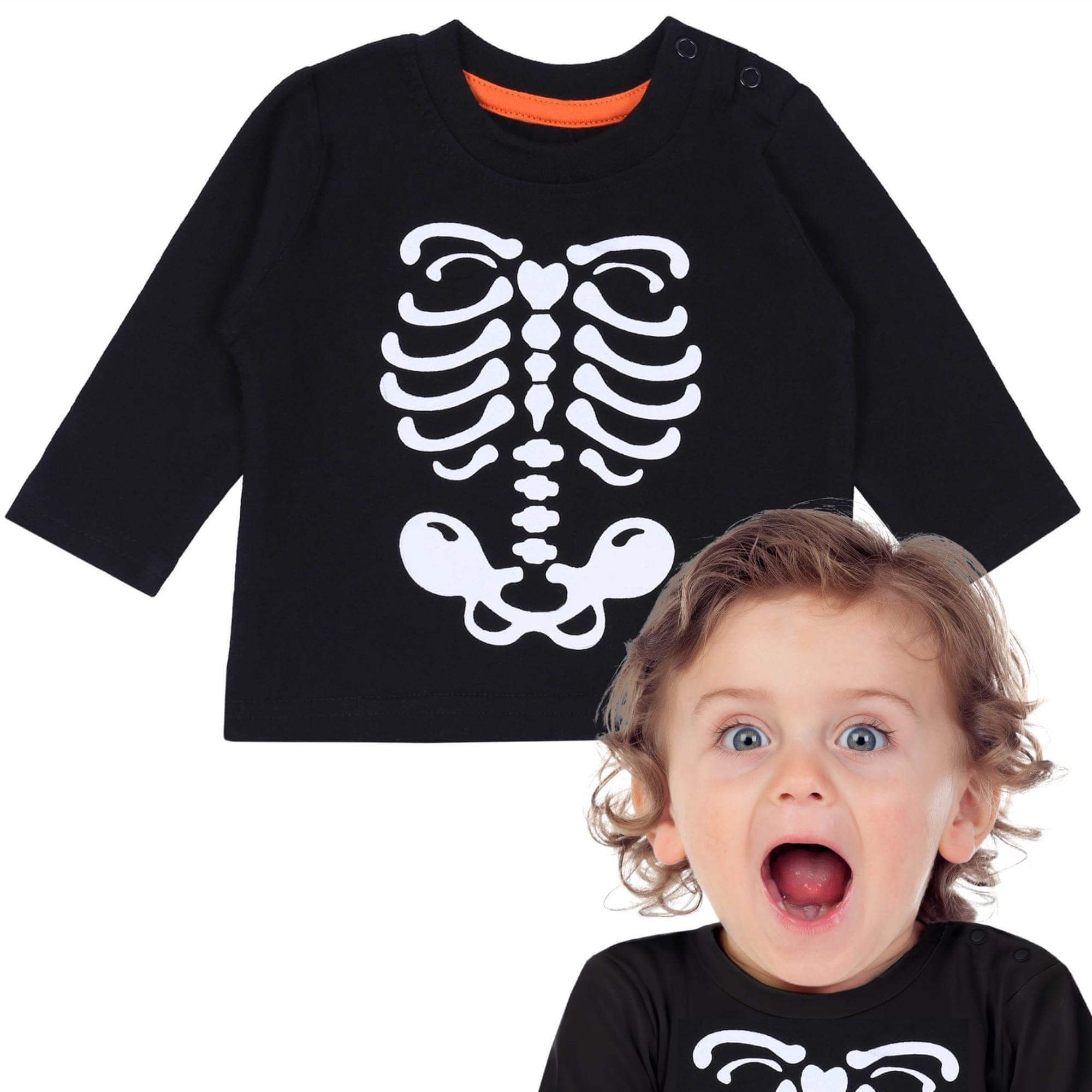 Črna majica z dolgimi rokavi, spredaj okrašena z natisnjenim motivom okostnjaka.Izrez je obrobljen z nežnim, neškodljivim elastičnim trakom, na rami pa ima zapenjanje na dva pritiskača.Izdelana iz visokokakovostnega, prijetnega bombaža.